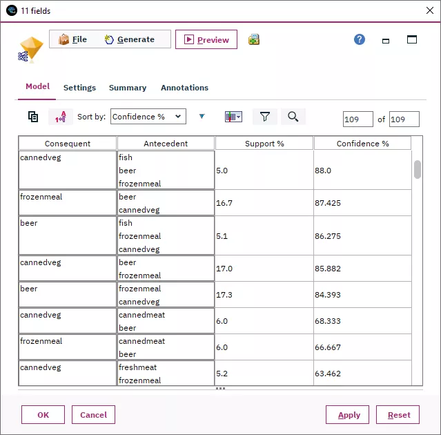 Result of the basket analysis model - according to the first rule, if the customer has fish, beer and frozen dishes in the basket, he will also buy canned vegetables. Such items in the basket will be found in 5% of the transactions, and the chance of this rule working is 88%.