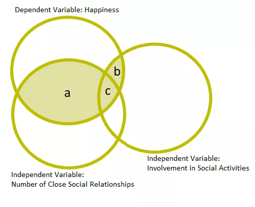 Sense of happiness is significantly explained by the number of close social relationships (box a) and to a slightly lesser extent by involvement in social activities (box b). There is also some collinearity between the two independent variables (box c).