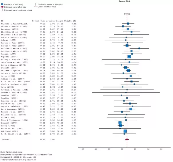 Each line represents one study with its estimated effect size, 95% confidence interval and weight in the meta-analysis. The blue squares represent the effect size of each study and the horizontal lines through these squares show their 95% confidence intervals. The size of the squares is proportional to the weight of the study in question. If the confidence interval crosses the vertical line at zero, it means that the study result is not statistically significant. The rhombus at the bottom of the graph shows the overall effect size (0.19) with a 95% confidence interval. The overall effect test indicates a statistically significant result (p = 0.00).
