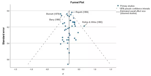 The funnel plot suggests that there is no significant publication bias in this meta-analysis because the points are relatively symmetrically distributed around the line representing the estimated total effect size. At the base of the graph are results obtained on small samples with a large standard error, and at the apex are studies obtained on large samples with a small standard error.