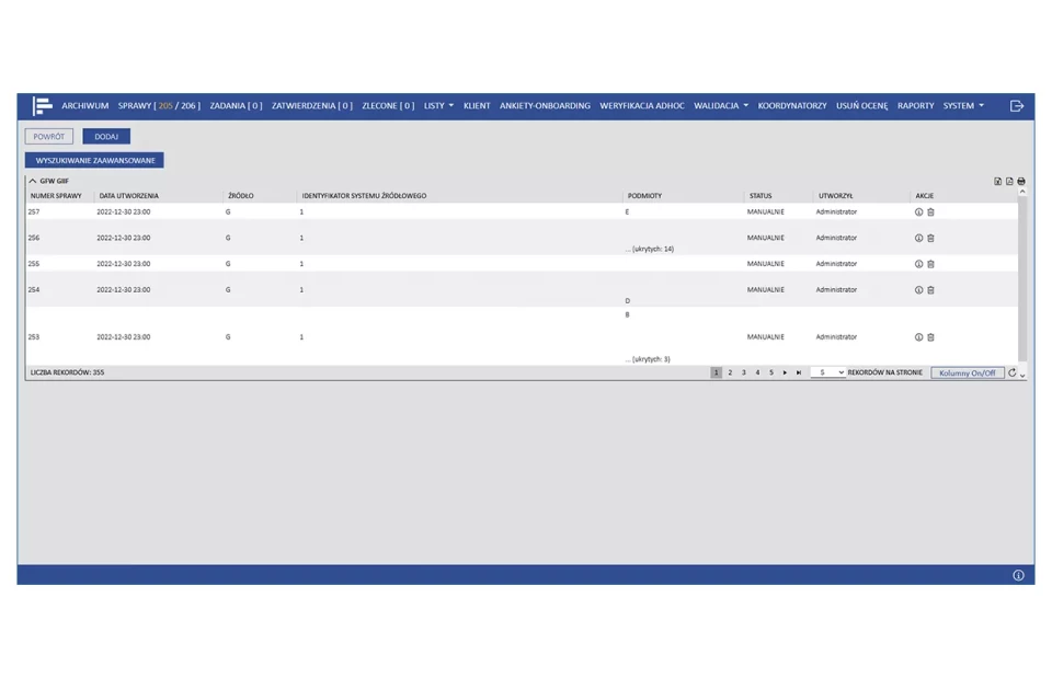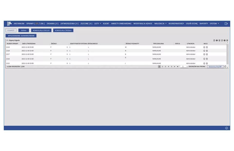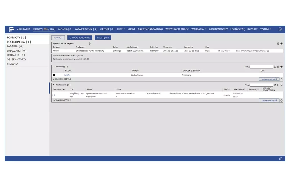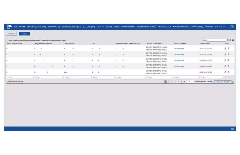 Automatyczne dostosowanie treści ankiet KYC w zależności od liczonej online oceny ryzyka AML. Dostęp do ankiet dla osób prowadzących proces onboardingu klienta z poziomu obsługiwanego sytemu crm. Wyniki ankiet dostępne są dla oficerów AML bezpośrednio w module obsługi spraw.