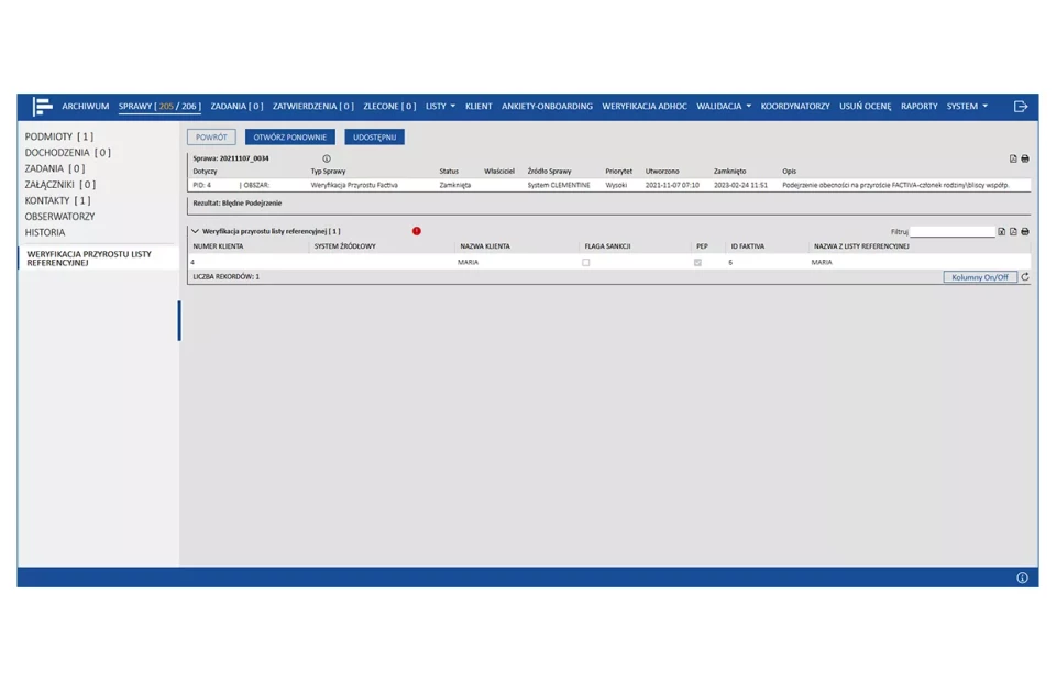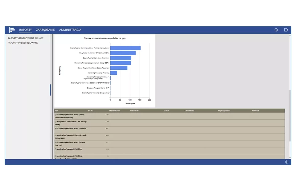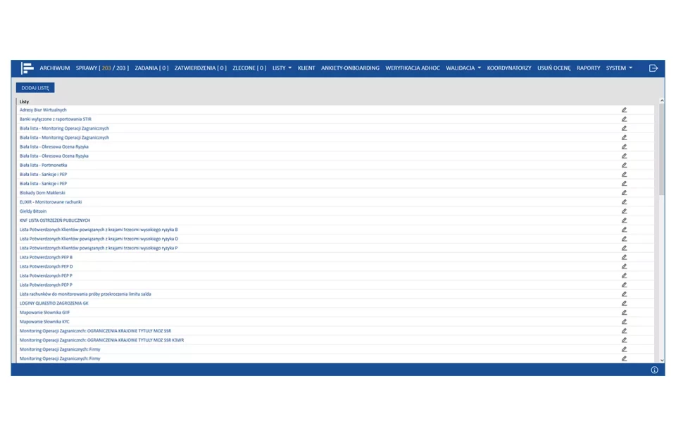 PS AML zapewnia obsługę pełnego procesu oceny ryzyka AML - od oceny klienta nowego, poprzez spełnienie wymagań związanych z realizacją wzmożonej identyfikacji i weryfikacji klientów, obsługą list sankcyjnych i PEP, cykliczną oceną klienta oraz monitoringiem transakcji.