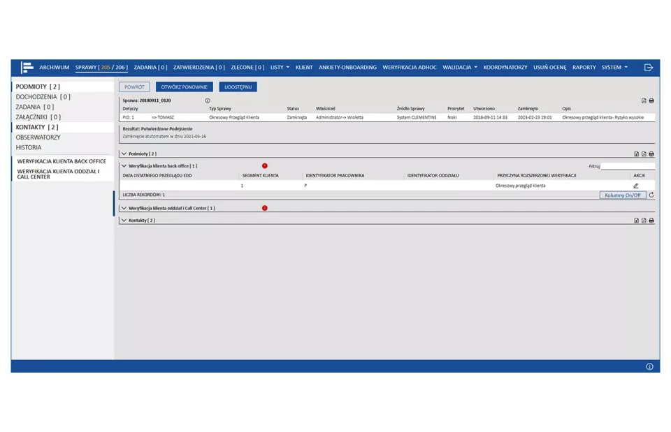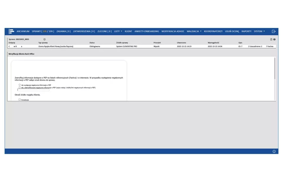 System posiada zaimplementowane modele oceny ryzyka adekwatne do etapu współpracy z klientami, w tym oparte o ocenę behawioralną klienta. Siatka ocen ryzyka oraz reguły typowania są konstruowane z wykorzystaniem komponentu analitycznego PS CLEMENTINE PRO.