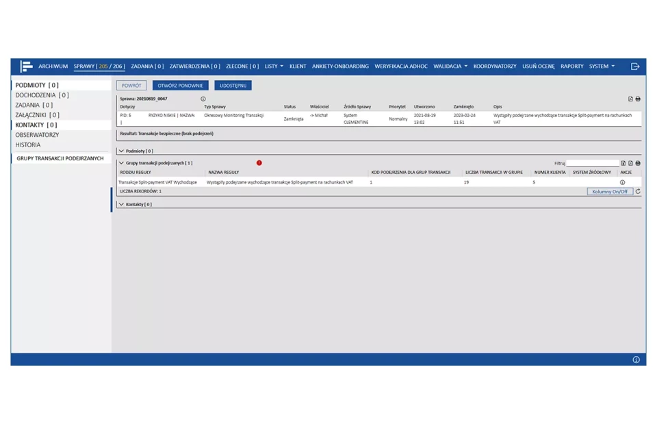 Integralną częścią środowiska jest dedykowany zespołowi AML pracującemu w działach compliance moduł do zarządzania alertami. Pozwala on na obsługę przypadków wskazujących na podwyższone ryzyko prania pieniędzy, tak aby alerty były adekwatne do typu sprawy (klient nowy, EDD, istniejący, monitoring transakcji).