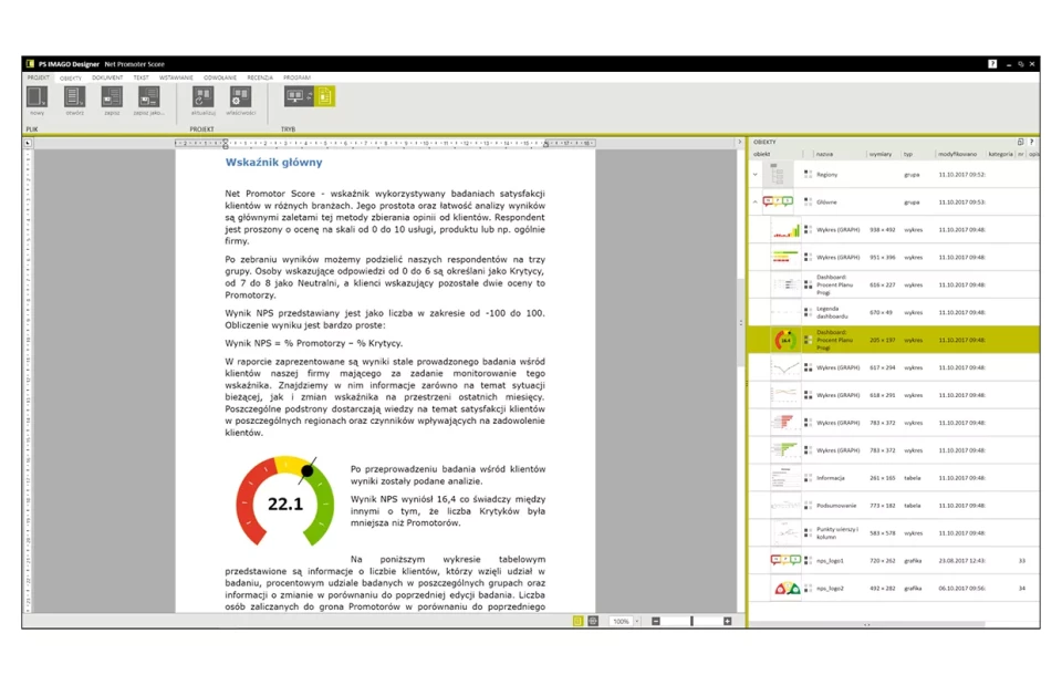 PS IMAGO PRO umożliwia przygotowanie raportów. Intuicyjne i elastyczne narzędzie pozwala samodzielnie określić format prezentacji a tabele i wykresy mogą zostać wzbogacone o komentarze. Gotowy dokument może zostać udostępniony odbiorcom online lub w postaci klasycznego dokumentu (docx, pdf).