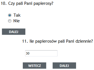 Zagadnienie reguł przejść rozpocznę od omówienia najprostszej postaci, czyli reguły bazującej na pytaniu rozstrzygającym tak/nie. Jeżeli respondentka twierdząco odpowie na pytanie dziesiąte: Czy pali Pani papierosy?, to w następnej kolejności pojawi się prośba o podanie liczby wypalanych dzienne sztuk papierosów. Niepalący ankietowani nie zobaczą tego pytania.
