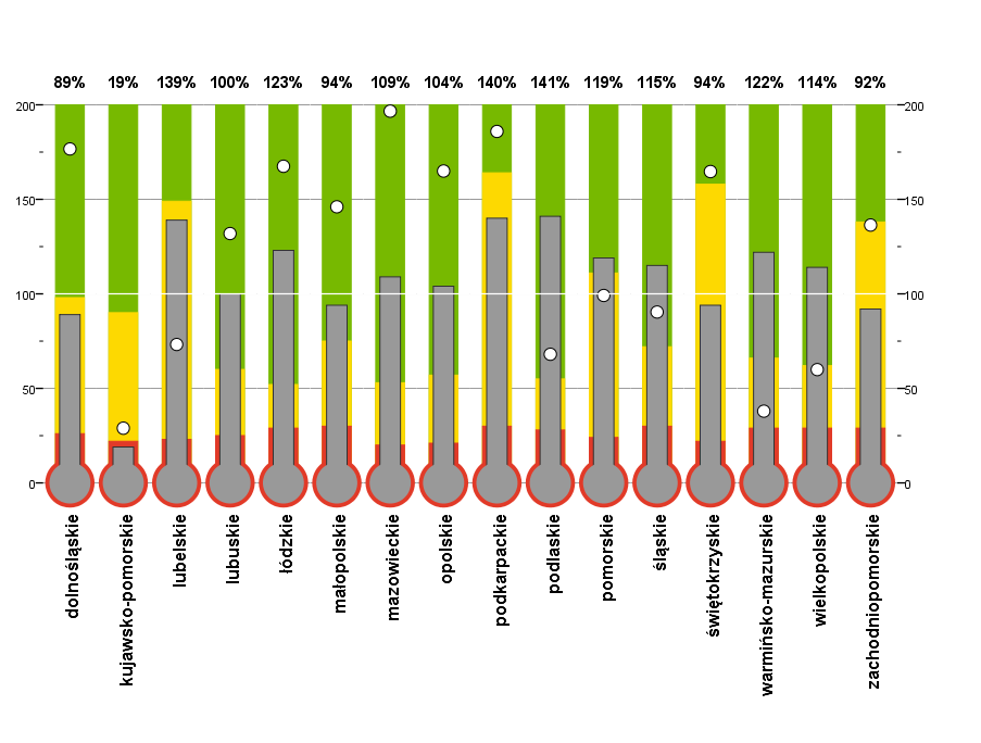 Znając powyższe wymagania łatwo ocenić, dlaczego poznany ostatnio bullet graph jest odpowiednią grafiką do zastosowania na dashboardzie. Kolejną wizualizacją tego typu są termometry. Spójrzmy na wykres poniżej.